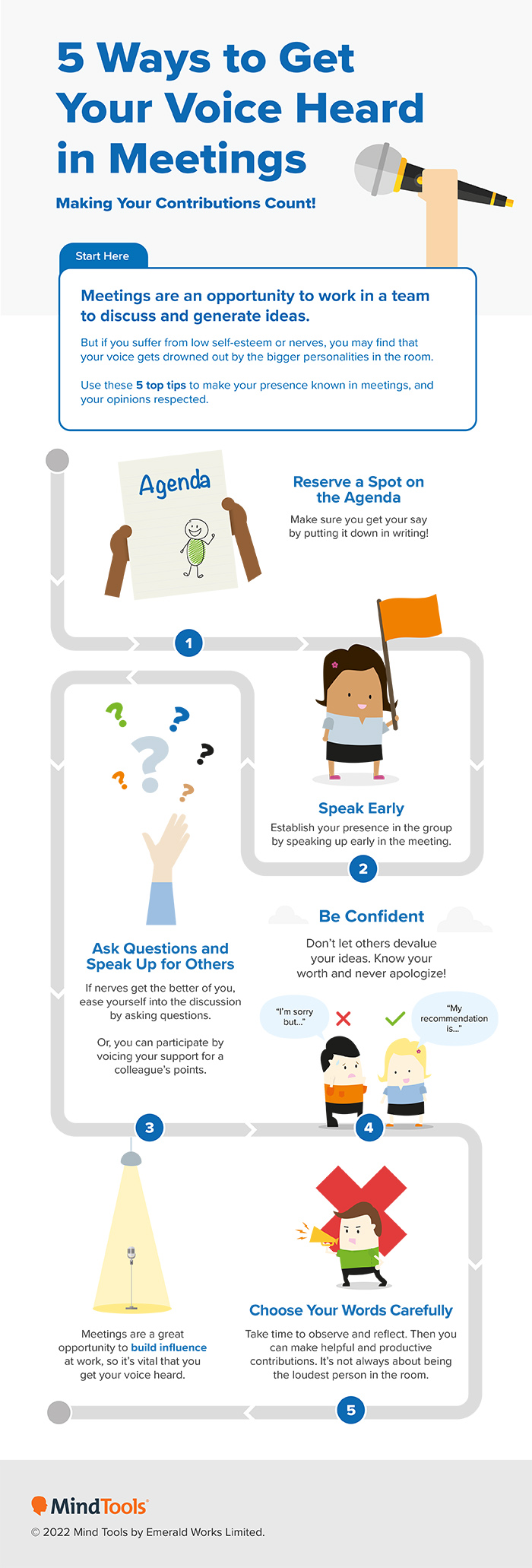 Content Hub Leadership and Management Meetings Effective Meetings 5 Ways to Get Your Voice Heard in Meetings Infographic May 17, 2024 5 Ways to Get Your Voice Heard in Meetings Infographic by Our content team Download transcript Share this post Discover more content audio 30 Minutes Meet Like You Mean It In this podcast, we talk to the author, speaker and communications expert Wayne Turmel about how to get virtual meetings right. Read now article 8 Minutes The Role of a Facilitator Good facilitation makes the difference between event success or failure. Learn how to be an effective facilitator, and find out how to develop the skills for the role. Read now article 9 Minutes 8 Ways To Add Value to Meetings Make meetings more informative and engaging, and perform at your best, by learning practical approaches to adding value to meetings. Read now