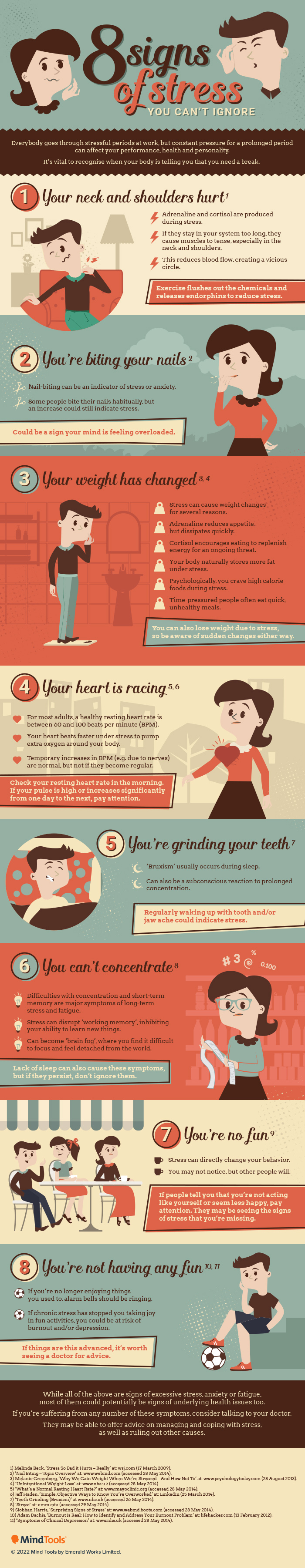 EIGHT SIGNS OF STRESS YOU CAN’T IGNORE Everybody goes through stressful periods at work, but constant pressure for a prolonged period can affect your performance, health and personality. It’s vital to recognize when your body is telling you that you need a break. One. Your neck and shoulders hurt. [1] Adrenaline and cortisol are produced during stress. If they stay in your system too long, they cause muscles to tense, especially in the neck and shoulders. This reduces blood flow, creating a vicious circle. Exercise flushes out the chemicals and releases endorphins to reduce stress. Two. You’re biting your nails. [2] Nail-biting can be an indicator of stress or anxiety. Some people bite their nails habitually, but an increase could still indicate stress. Could be a sign your mind is feeling overloaded. Three. Your weight has changed. [3] [4] Stress can cause weight changes for a several reasons. Adrenaline reduces appetite but dissipates quickly. Cortisol encourages eating to replenish energy for an ongoing threat. Your body naturally stores more fat under stress. Psychologically, you crave high calorie foods during stress. Time-pressured people often eat quick, unhealthy meals. You can also lose weight due to stress, so be aware of sudden changes either way. Four. Your heart is racing. [5] [6] For most adults, a healthy resting heart rate is between sixy and one hundred beats per minute BPM. Your heart beats faster under stress to pump extra oxygen around your body. Temporary increases in BPM e.g. due to nerves are normal, but not if they become regular. Check your resting heart rate in the morning. If your pulse is high or increases significantly from one day to the next, pay attention. Five. You’re grinding your teeth. [7] Bruxism usually occurs during sleep. Can also be a subconscious reaction to prolonged concentration. Regularly waking up with tooth and/or jaw ache could indicate stress. Six. You can’t concentrate. [8] Difficulties with concentration and short-term memory are major symptoms of long-term stress and fatigue. Stress can disrupt working memory, inhibiting your ability to learn new things. Can become brain fog, where you find it difficult to focus and feel detached from the world. Lack of sleep can also cause these symptoms, but if they persist, don’t ignore them. Seven. You’re no fun. [9] Stress can directly change your behavior. You may not notice, but other people will. If people tell you that you’re not acting like yourself or seem less happy, pay attention. They may be seeing the signs of stress that you’re missing. Eight. You’re not having any fun. [10] [11] If you’re no longer enjoying things you used to, alarm bells should be ringing. If chronic stress has stopped you taking joy in fun activities, you could be at risk of burnout and/or depression. If things are this advanced, it’s worth seeing a doctor for advice. While all of the above are sings of excessive stress, anxiety or fatigue, most of them could potentially be signs of underlying health issues too. If you’re suffering from any number of these symptoms, consider talking to your doctor. They may be able to offer advice on managing and coping with stress, as well as ruling out other causes.