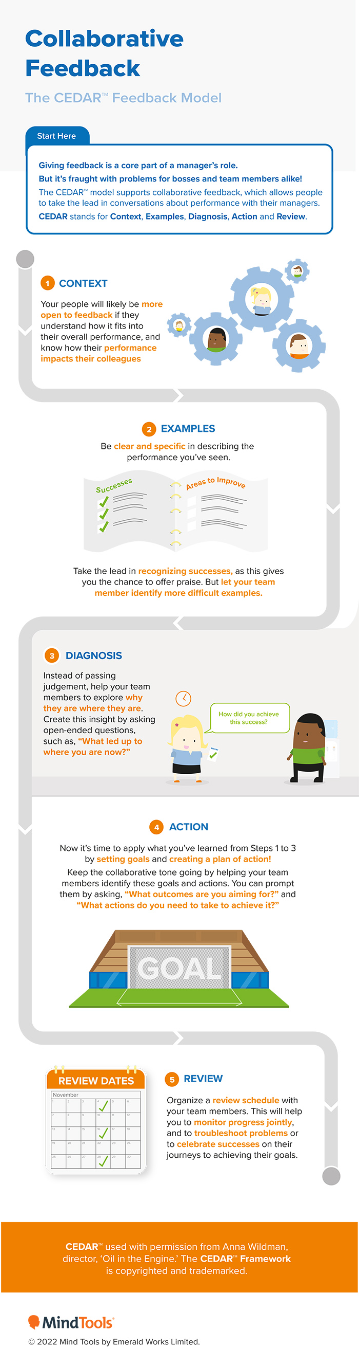 Content Hub Personal Development Working With Others Collaborative Working CEDAR™ Feedback Infographic May 17, 2024 CEDAR™ Feedback Infographic by Our content team Download transcriptReferencesWildman, A. (2021). 'Now You’re Talking! The Manager’s Complete Handbook to Leading Great Conversations at Work – Even the Tough Ones,' Oil in the Engine Worldwide Share this post Discover more content article 5 Minutes Build Your Own Brain Trust How to harness the creative benefits of Pixar's secret weapon. Read now article 3 Minutes Ten Tools For Effective Collaboration A short run-down of ten tools you can use to collaborate effectively with others. Read now article 3 Minutes Working Well With Others Top tips to help you forge positive working relationships. Read now