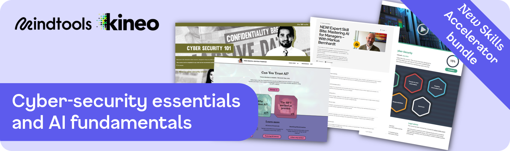 To recognise Cyber Security Month at Mindtools and Kineo, we’ve developed a powerful training bundle, to help organizations tackle today’s most urgent digital threats, from AI misuse to data protection. It includes a mix of new Kineo Shorts and Mindtools expert-led courses, teaching you how to evaluate AI outputs critically and decide when to trust — or question — what AI tells you.
