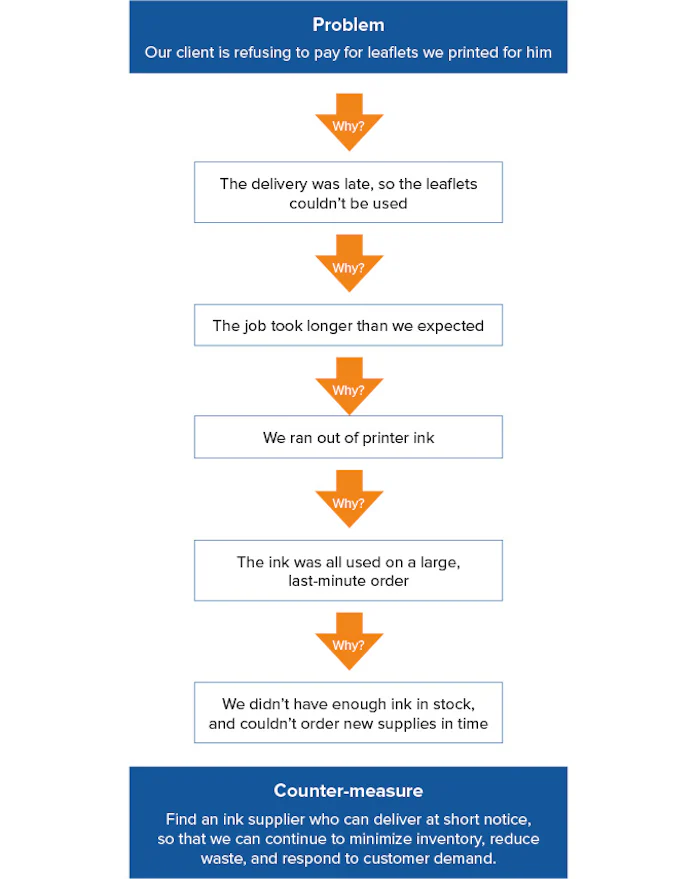 This simple 5 Whys technique, however, can often direct you quickly to the root cause of a problem. So, whenever a system or process isn't working properly, give it a try before you embark on a more in-depth approach – and certainly before you attempt to develop a solution.