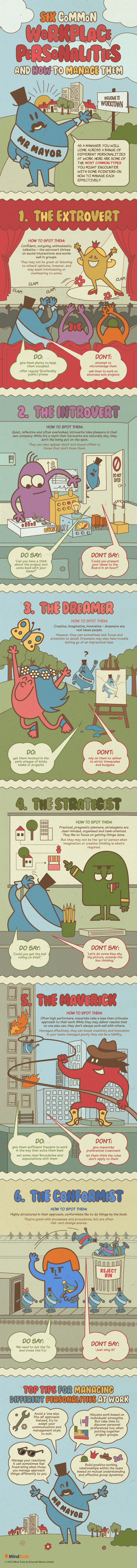Six Common Workplace Personalities And How To Manage Them. As a manager, you will come across a range of different personalities at work. Here are some of the most common types you might encounter, with some pointers on how to manage each effectively. One. The Extrovert. How to spot them. Confident, outgoing, enthusiastic and talkative, the extrovert thrives on social interactions and works well in groups. They may not be great at listening to others’ opinions, however, and may seem intimidating or overbearing to some. Do. Give them plenty to keep them occupied. Offer regular preferably public praise. Don’t. Attempt to micromanage them. Ask them to work on extended solo projects. Two. The Introvert. How to spot them. Quiet, reflective and often overlooked, introverts take pleasure in their own company. While it’s a myth that introverts are naturally shy, they don’t like being put on the spot. They can also appear aloof and stand-offish to those that don’t know them. Do say. Can you have a think about the project and come back with your ideas. Don’t say. Could you present your ideas to the Board in an hour. Three. The Dreamer. How to spot them. Creative, imaginative, innovative, dreamers are real ideas people. However, they can sometimes lack focus and attention to detail. Dreamers may also have trouble letting go of an impractical idea. Do. get them involved in the early stages of tricky tasks or projects. Don’t. rely on them to deliver to strict timescales and budgets. Four. The Strategist. How to spot them. Practical, pragmatic planners, strategists are clear-minded, organized and task-oriented. They like to focus on getting things done. But they may not be the go-to person when imagination or creative thinking is what’s required. Do say. Could you get the ball rolling on this. Don’t say. Let’s do some blue sky, big picture, out of the box thinking. Five. The Maverick. How to spot them. Often high performers, mavericks take a less than orthodox approach to their work. While they may deliver results that no one else can, they don’t always work well with others. Managed effectively, they can boost creativity and innovation in your team. managed poorly, they can be a liability. Do. Give them sufficient freedom to work in the way that suits them best. Set some clear boundaries and expectations with them. Don’t. Give mavericks preferential treatment Let them think the rules don’t apply to them Six. The Conformist. How to spot them. Highly structured in their approach, conformists like to do things by the book. They’re great with processes and procedures, but are often risk and change averse. Do say. We need to dot the I’s and cross the t’s. Don’t say. Just wing it. Top tips for managing different personalities at work. Avoid a one size fits all approach. Instead, try to adapt your communication and management style to suit. Allocate work based on individuals’ strengths. But take time to discover personal preferences too, when putting together project groups. Manage your reactions. It can sometimes feel frustrating when those you manage do things differently to you. Build positive working relationships within the team based on mutual understanding and effective group dynamics.
