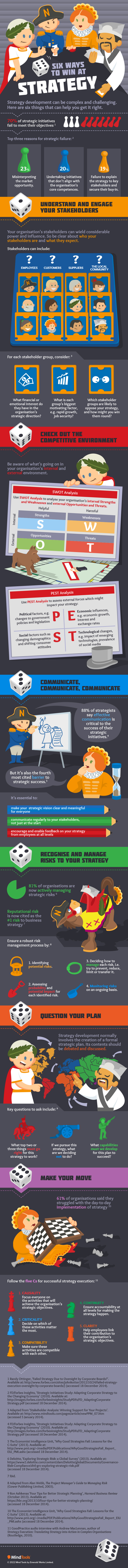 Six Ways to Win at Strategy. Strategy development can be complex and challenging. Here’s six things that can help you get it right. Seventy percent of strategic initiatives fail to meet their objectives [1] Top three reasons for strategic failure. [2] Misinterpreting the market opportunity. twenty three percent. Undertaking initiatives that don’t align with organization’s core competences. twenty percent. Failure to explain the strategy to key stakeholders and secure their buy-in. nineteen percent. Understand and engage your stakeholders. Your organization’s stakeholders can wield considerable power and influence. So be clear about who your stakeholders are and what they expect. Stakeholders can include. Employees. Customers. Suppliers. The local community. For each stakeholder group, consider. [3] What financial or emotional interest do they have in the organization’s strategic direction. What is each group’s biggest motivating factor, e.g. rapid growth, job security. Which stakeholder groups are likely to oppose your strategy, and how might you win them round. Check out the competitive environment. Be aware of what’s going on in your organization’s internal and external environment. SWOT Analysis. Use SWOT Analysis to analyze your organization’s internal Strengths and Weaknesses and external Opportunities and Threats. PEST Analysis. Use PEST Analysis to assess external forces which might impact your strategy. Political factors, e.g. changes to government policies and legislation. Economic influences e.g. economic growth, interest and exchange rates. Social factors such as changing demographics and shifting consumer attitudes. Technological changes, e.g. impact of emerging technologies, prevalence of social media. Communicate, communicate, communicate. Eighty eight percent of strategists say effective communication is critical to the success of their strategic initiatives. [4] But it’s also the fourth most cited barrier to strategic success. [5] It’s essential to. make your strategic vision clear and meaningful for everyone. communicate regularly to your stakeholders, not just at the start. encourage and enable feedback on your strategy from employees at all levels. Recognize and manage risks to your strategy. Eighty one percent of organizations are now actively managing strategic risks. [6] Reputational risk is now cited as the number one risk to business strategy. [7]Ensure a robust risk management process by. [8] One. Identifying potential risks. Two. Assessing probability and potential impact for each identified risk. Three. Deciding how to manage each risk, i.e. try to prevent, reduce, limit or transfer it. Four. Monitoring risks on an ongoing basis. Question your plan. Strategy development normally involves the creation of a formal strategic plan. Its contents should be debated and discussed. Key questions to ask include. [9] What top two or three things must go right for this strategy to work If we pursue this strategy, what are we deciding not to do. What capabilities must we develop for this plan to succeed. Make your move. Sixty one percent of organizations said they struggled with the day-to-day implementation of strategy. [10] Follow the five Cs for successful strategy execution. [11] One. Causality. Focus everyone on the activities that will achieve the organization’s strategic objectives. Two. Criticality. Decide on which of these activities matter the most. Three. Compatibility. Make sure these activities are compatible with each other. Four. Continuity. Ensure accountability at all levels for making the strategy happen. Five. Clarity. Help employees link their contribution to the organization’s strategic objectives.