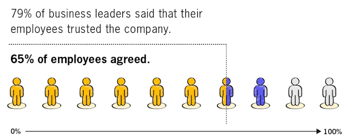 Organizations that lack trust quickly fall behind those where people trust one another and trust their leaders – and these organizations don’t always see the problem. Research by PricewaterhouseCoopers (PwC) showed that 79 percent of business executives said that their employees trusted the company, while only 65 percent of employees agreed.