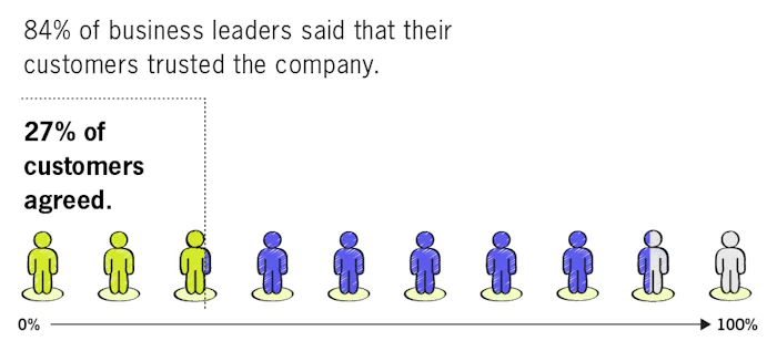 The gap was wider for consumers – 84 percent of leaders thought that customers highly trusted the company, yet less than one third of customers said the same. [2]